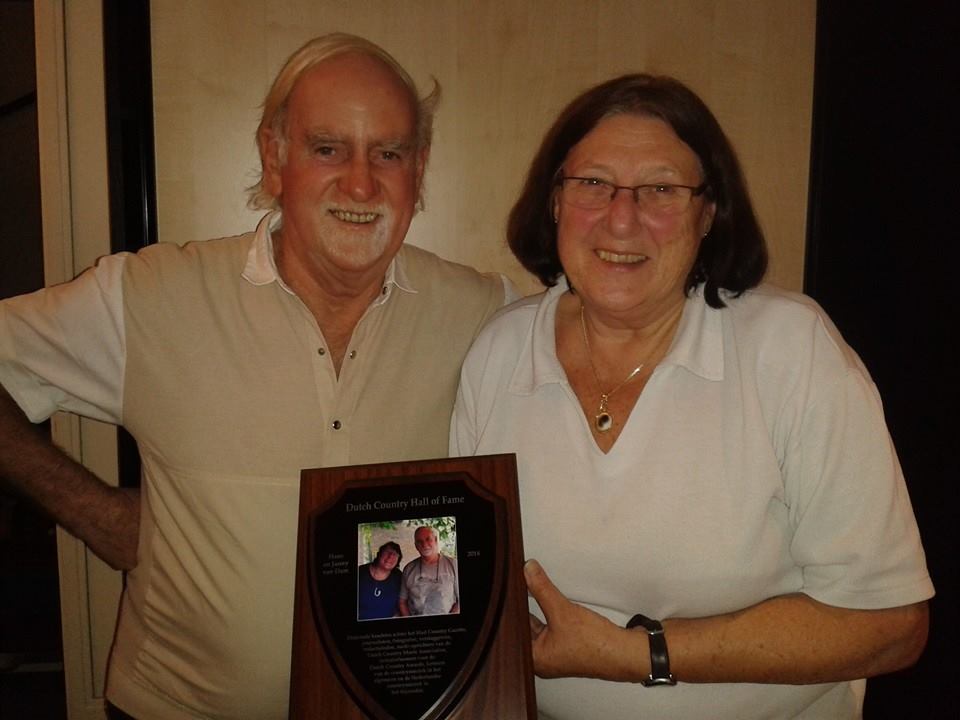 Country Gazette in de Country Music Hall of Fame 2014 een Country Music Hall of Fame 2014 onderscheiding voor Hans en Janny van Dam. “Drijvende krachten achter het blad Country Gazette, journalisten, fotografen, verslaggevers, redactieleden, mede-oprichters van de Dutch Country Music Association, initiatiefnemers voor de Dutch Country Awards, kenners van de countrymuziek in het algemeen en de Nederlandse countrymuziek in het bijzonder”. Deze mooie woorden werden uitgesproken door Richard Lamers, secretaris van de DCMA, tijdens het 30ste Dutch Country Music Awards Gala, gehouden op 8 november 2014 in de Voorste Vennen te Drunen. Het aanwezige echtpaar was totaal verrast door dit eerbetoon. Na stopzetting van Country Gazette in 2008 leefde de agenda online nog steeds voort. Sinds 2008 heeft Hans zijn programma Greenheart Country op diverse lokale stations. De award, met deze mooie woorden, heeft een plaats gekregen, naast eerdere onderscheidingen, in de hal van hun eigen ‘kleine museum’ in Boskoop. Postuum eerbetoon aan Rineke van Beek Op die zelfde avond werd postuum ook aan Rineke van Beek een zelfde award uitgereikt, met vergelijkbare mooie woorden. Voor haar 25 jarige betrokkenheid als (mede) redactielid en internationaal vertegenwoordigster van Country Gazette, evenals haar betrokkenheid bij Nashville FM, waar ze na CG aan verbonden was. De award werd door haar moeder, Mevrouw Henny Koert, in ontvangst genomen. Een emotioneel moment en een terecht eerbetoon dat met applaus werd beloond. |